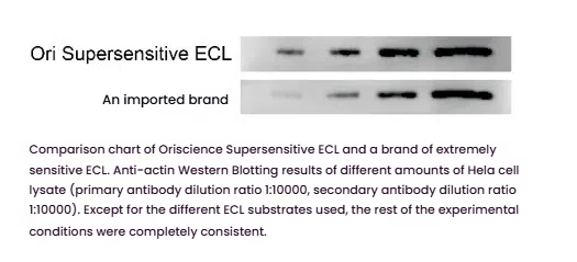 Oriscience Supersensitive ECL Kit is an extremely sensitive ECL chemiluminescent kit based on horseradish peroxidase (horseradish peroxidase, HRP). This kit optimizes the composition of the chemiluminescent solution and uses a new enhancer and oxidant that is different from the common luminol-H2O2 system. It has the characteristics of extremely high sensitivity, rapid luminescence, strong brightness, and good stability. It can use a higher antibody dilution multiple (1:5000~1:10000), thus saving antibodies to a great extent. The reagent does not contain toxic ingredients, and the experiment is safer.